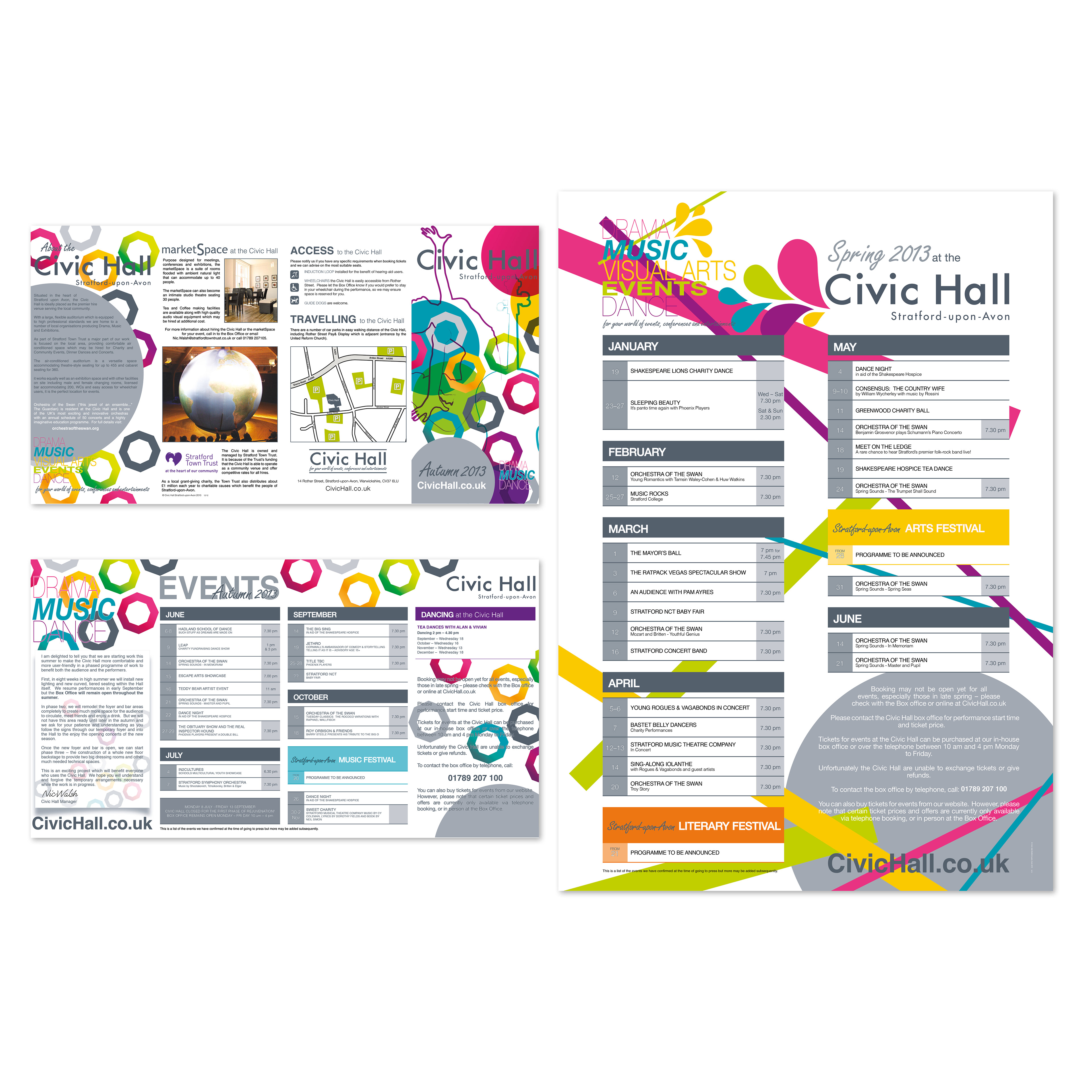I was approached by the Civic Hall in Stratford-upon-Avon to redesign their Events leaflet and Posters. Each Season they wanted a different theme which was neutral and didn’t give too much emphasis on the individual forms or art/s. I continued to work with them until they had a change of house manager and they decided to rebrand.